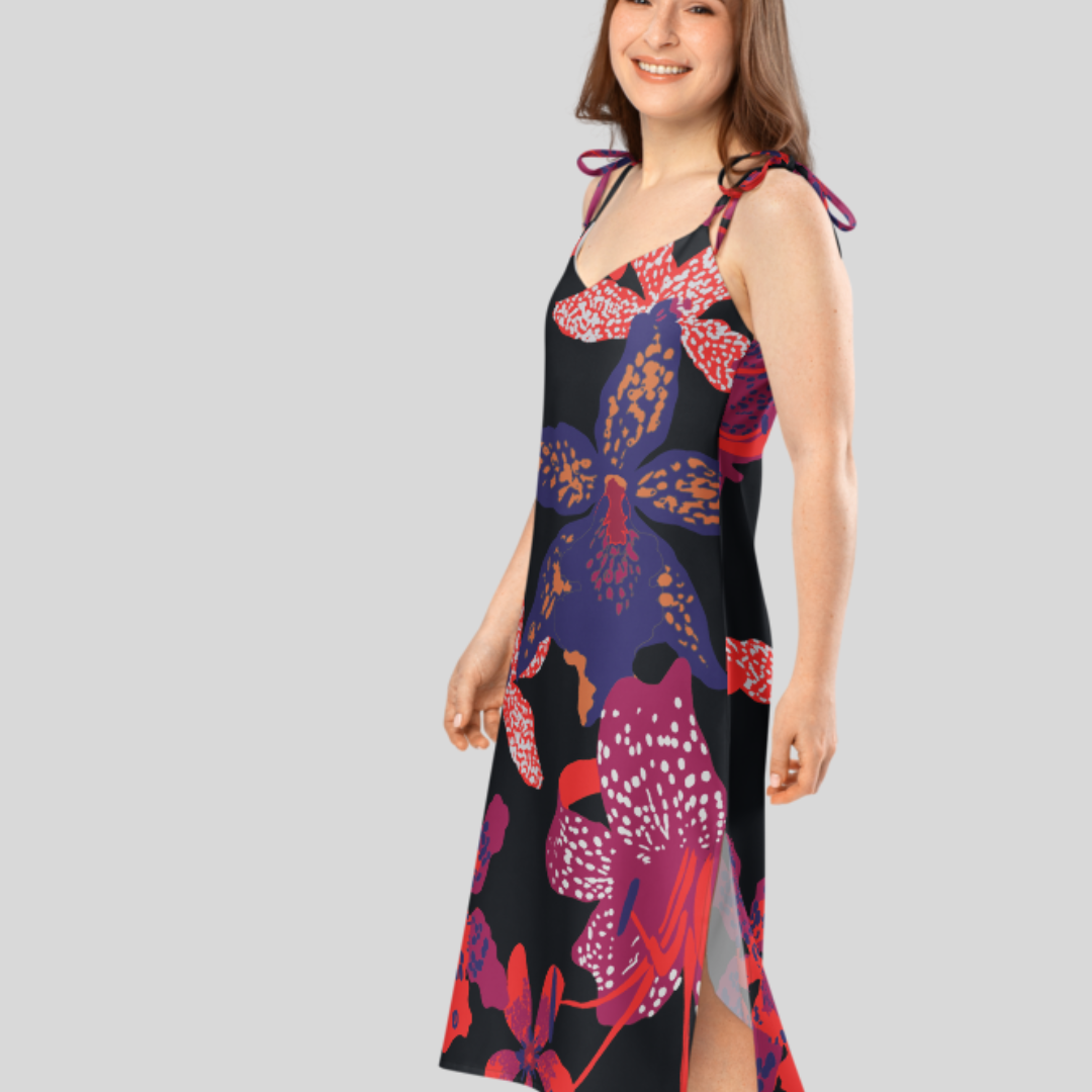 Floral Chiffon Midi Dress: Black Slip Dress with Built-in Bra